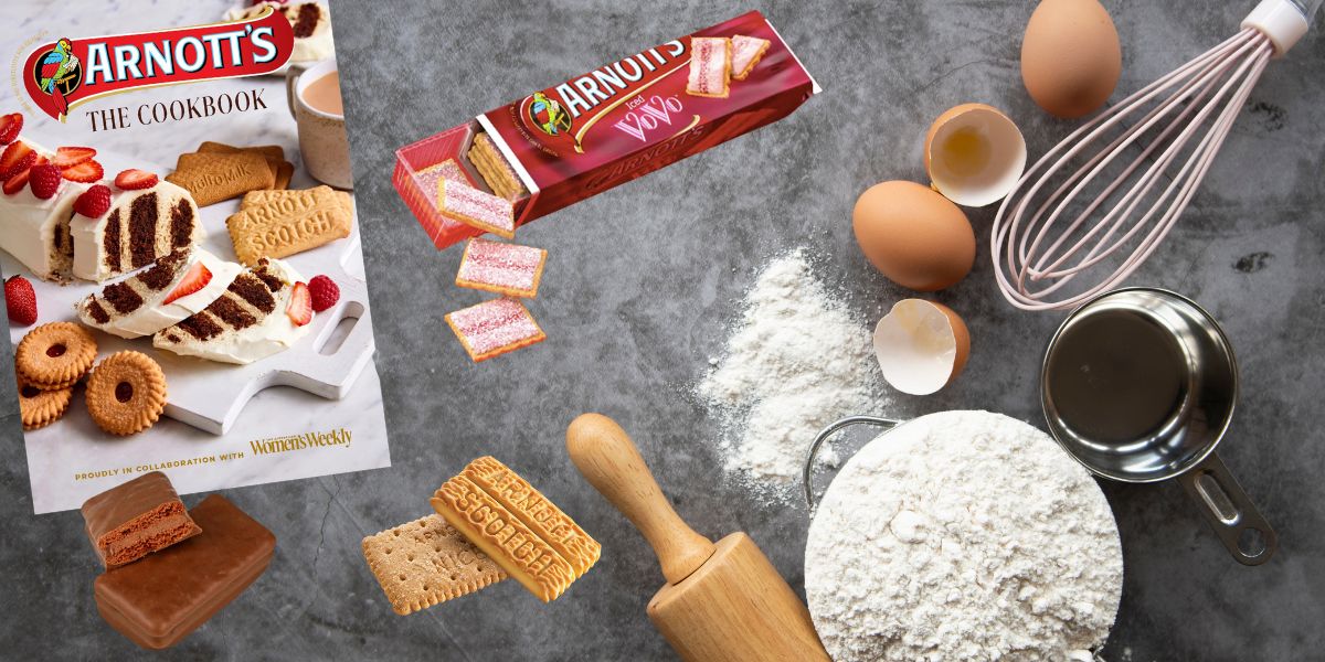Arnott’s The Cookbook is priced at $24.99 and is available at retailers like Big W, Kmart, Amazon, Target, QBD, and Booktopia.